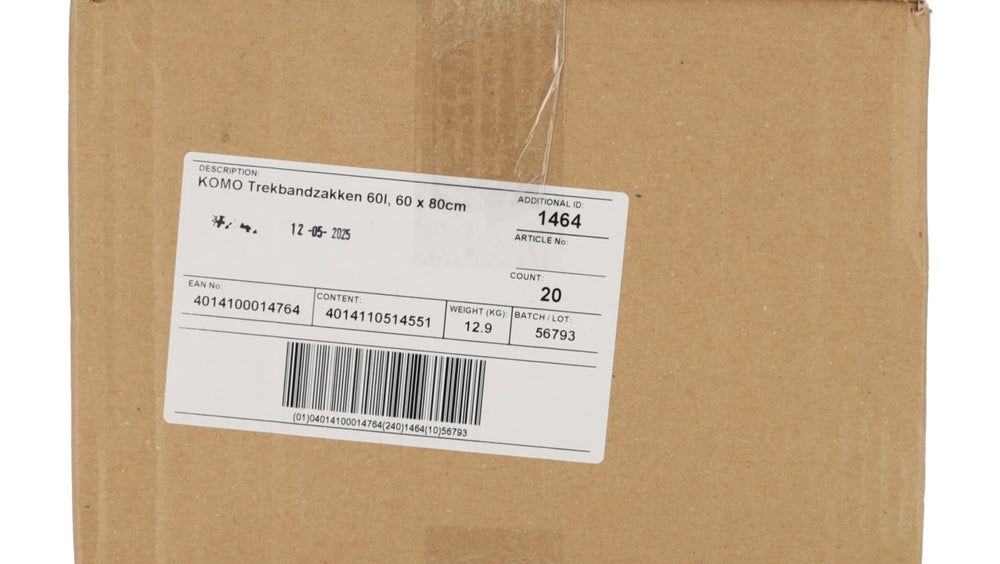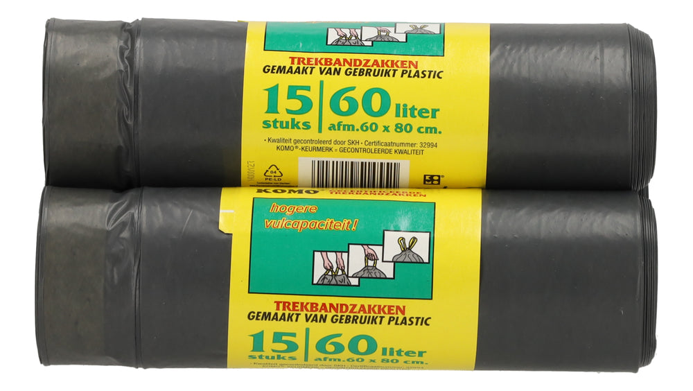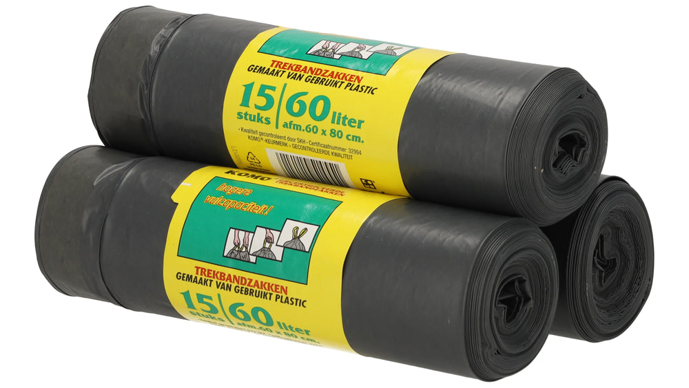Deze KOMO trekbandzakken op rol bieden een praktische oplossing voor dagelijks afvalbeheer in zowel de keuken als het magazijn. De zakken zijn vervaardigd uit gerecycled zwart LDPE plastic, wat zorgt voor een hoge treksterkte en betrouwbaarheid bij zwaardere vullingen. Met een afmeting van 60x80 cm en een inhoud van 60 liter passen ze uitstekend in de standaard pedaalemmer of vuilnisbak.