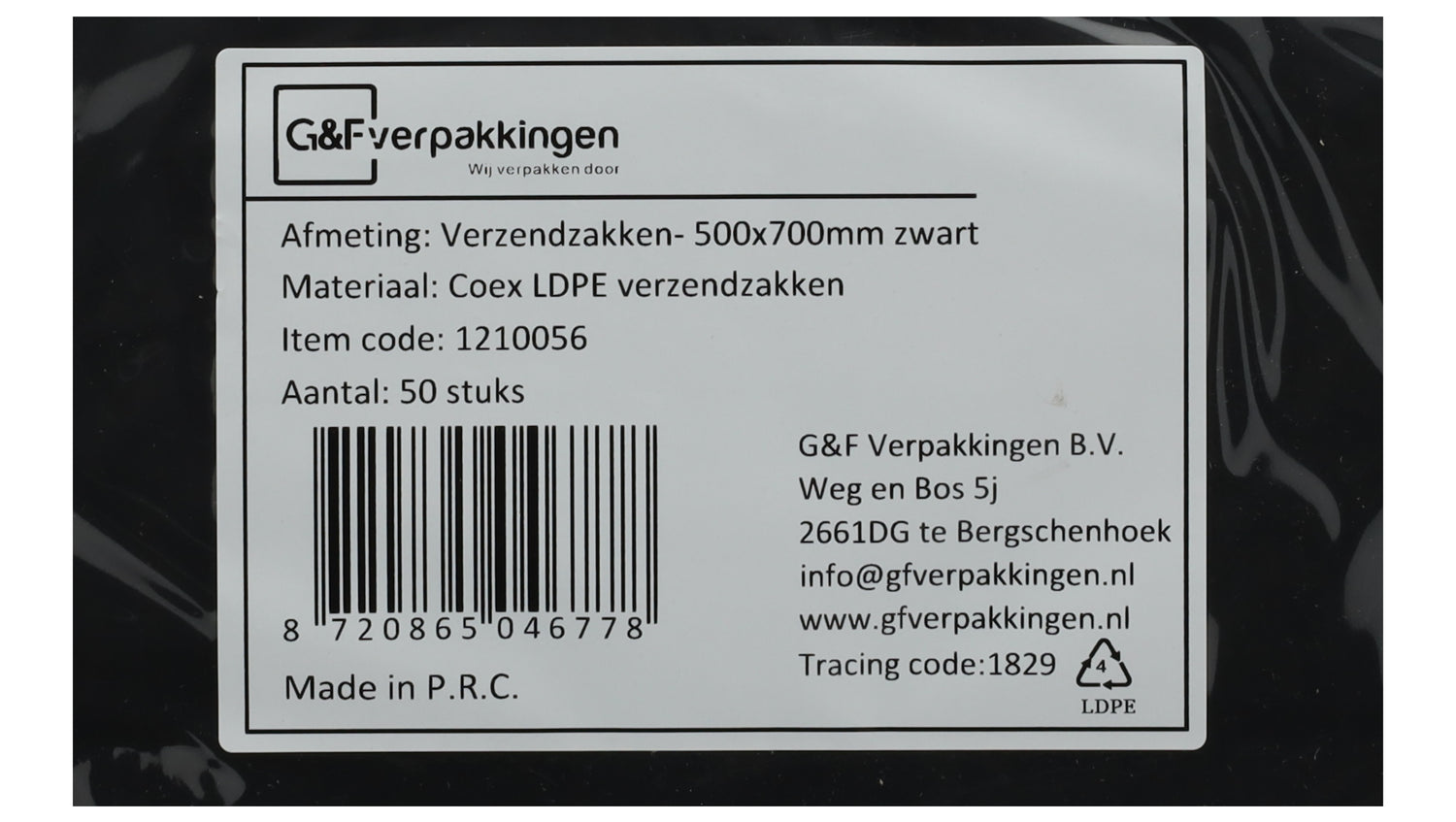 Specificaties van de zwarte verzendzak